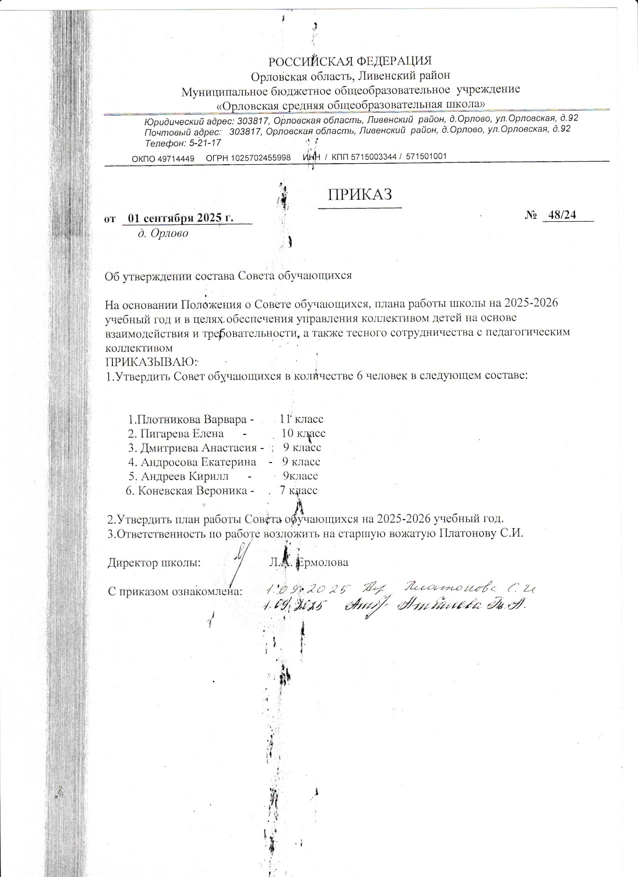 Приказ об утверждении состава Совета обучающихся